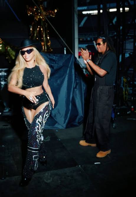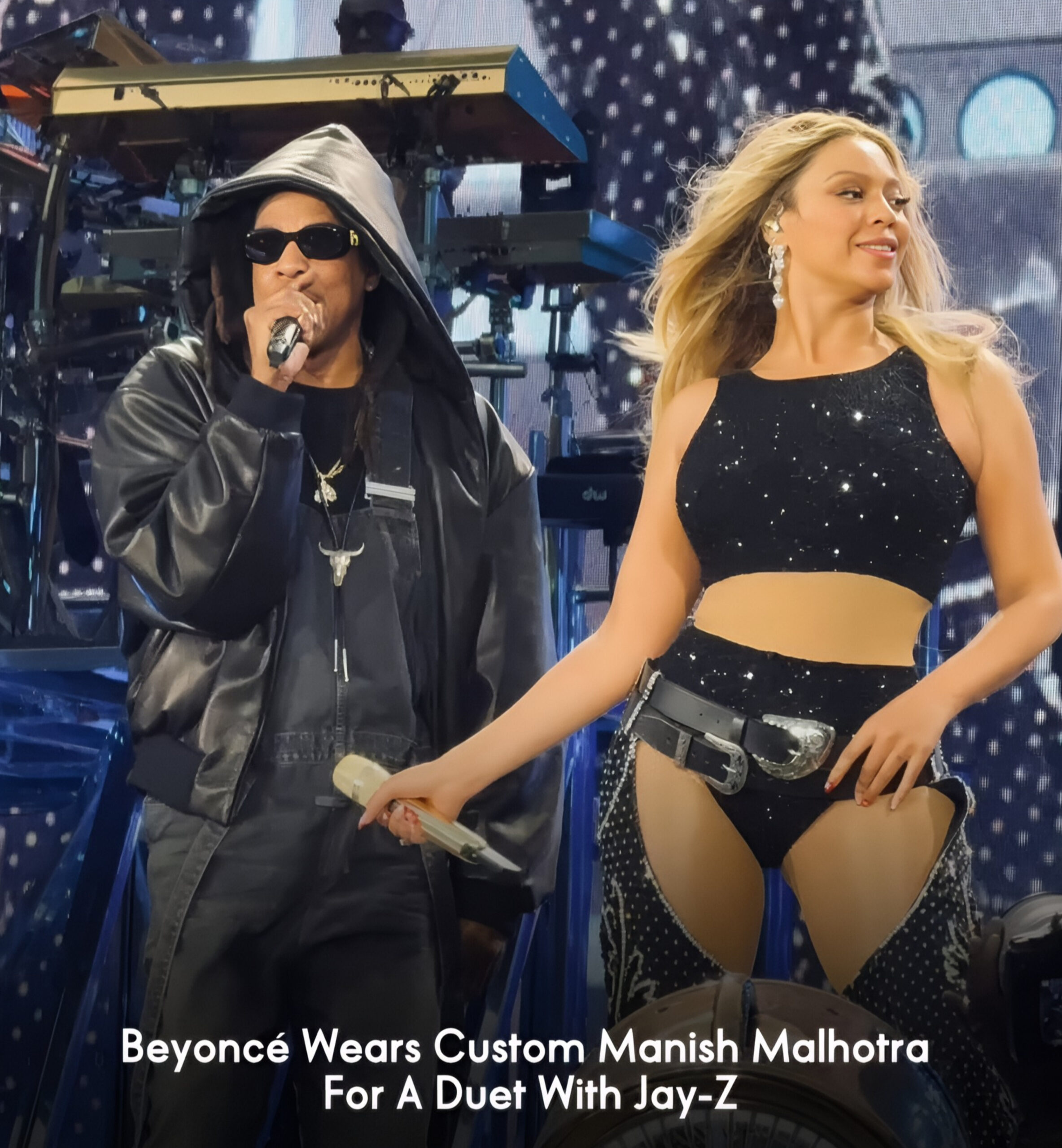 Crafted in the style of vintage cowboy chaps, the outfit fused Beyoncé’s fierce stage persona with Malhotra’s signature opulence. The all-black ensemble was a perfect blend of sass and sparkle, featuring sequins, intricate threadwork, and a bold metallic belt. The superstar wore the outfit during a high-octane performance of Crazy in Love with husband Jay-Z, giving fans a double dose of power couple magic and fashion fire.